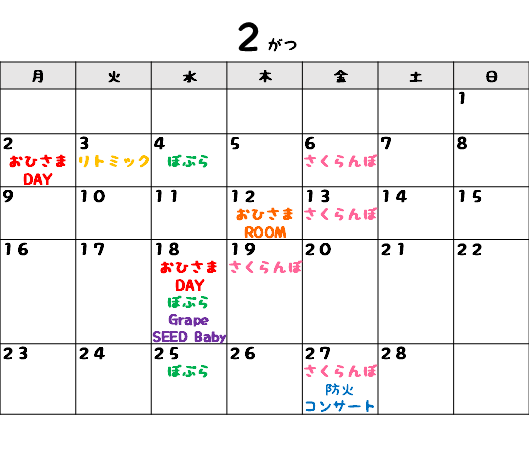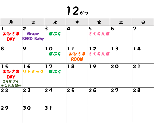 1歳児向けの年間10回(前期5回・後期5回)開催する定期リトミックです。ピアノに合わせて親子でスキンシップ遊び、からだ遊び、プチマッサージをします。音やリズムへの反応が敏感な乳幼児の時期に、音楽と楽しくふれあいませんか。
